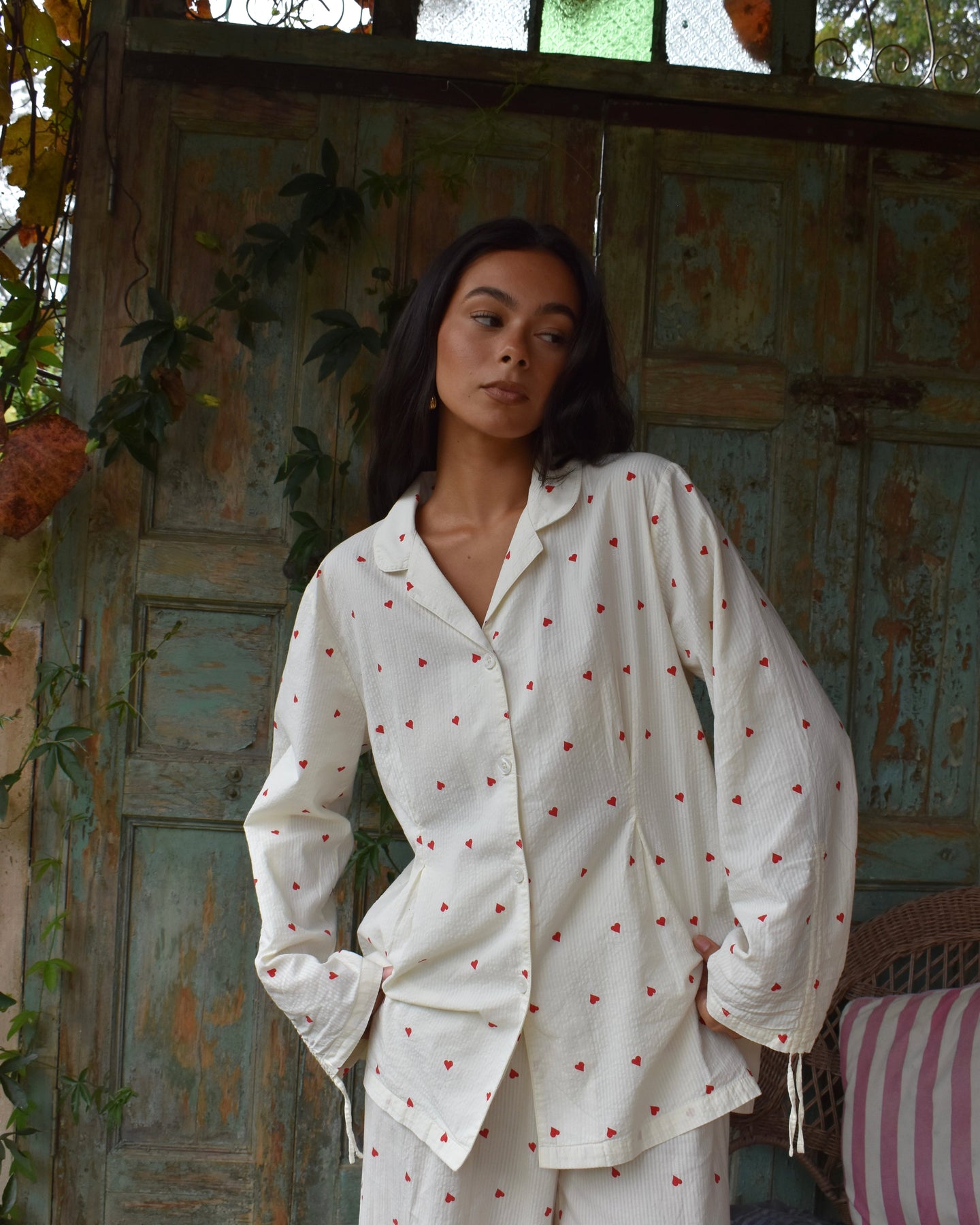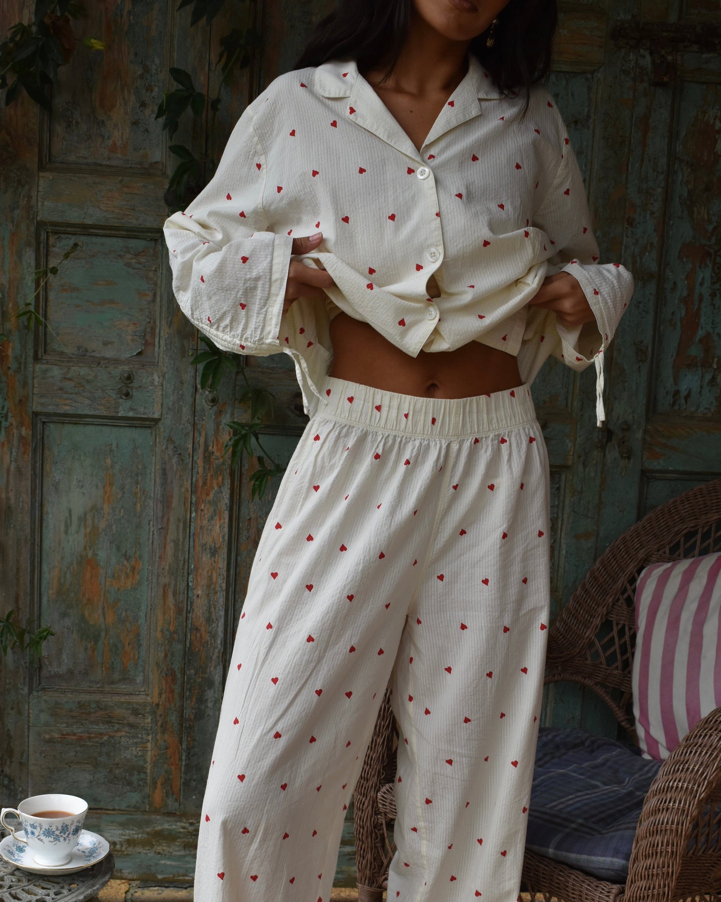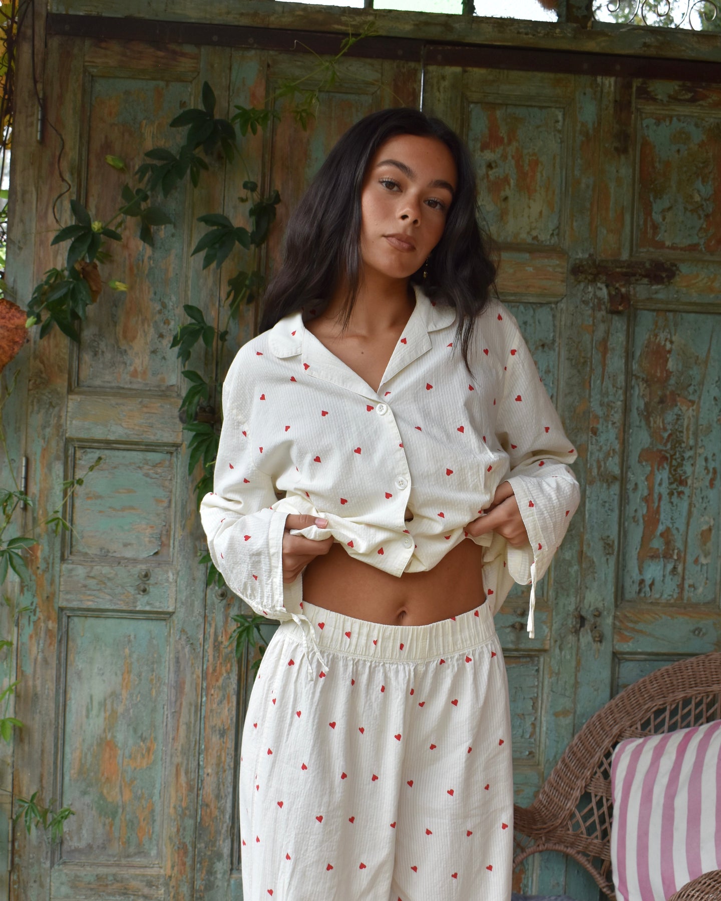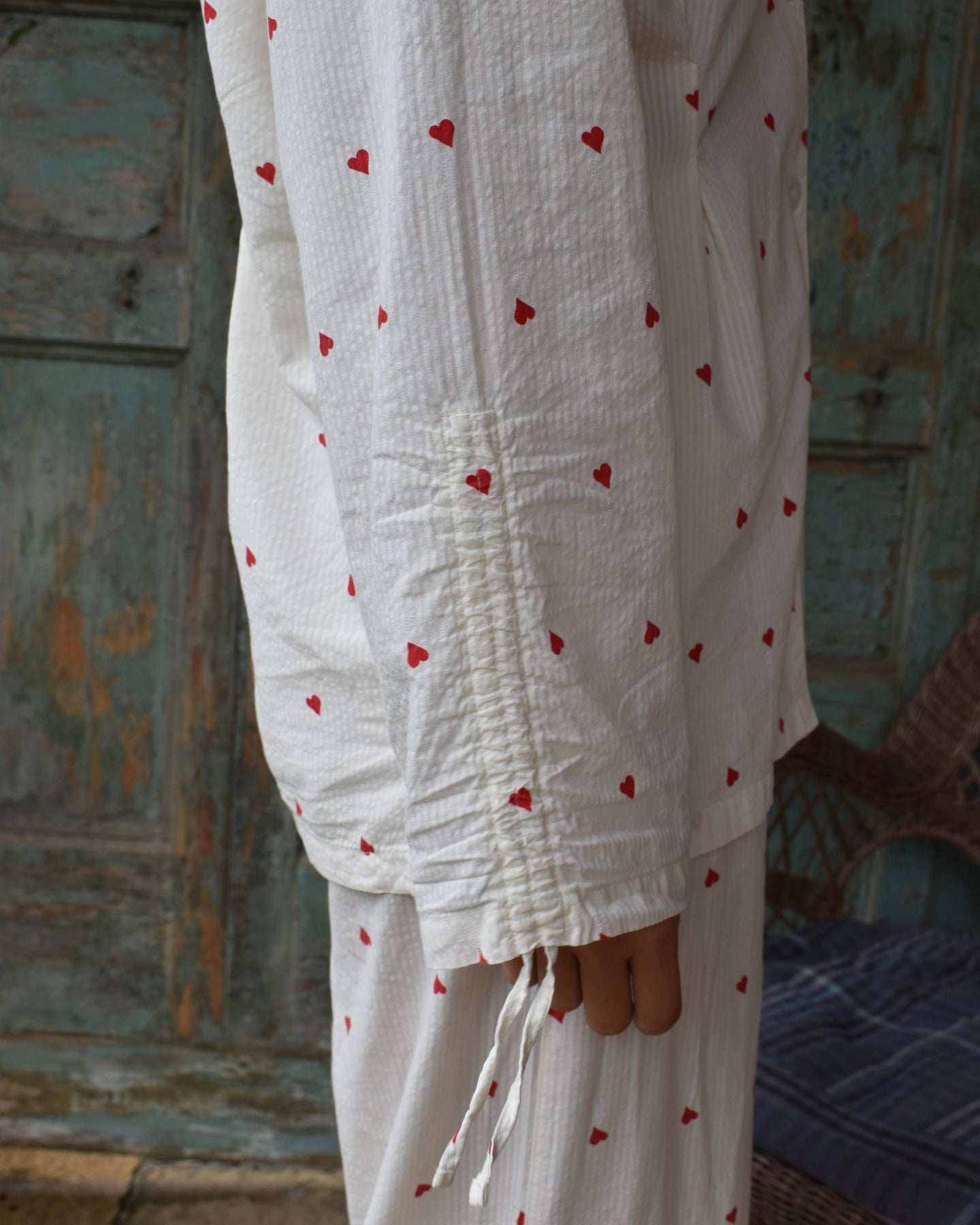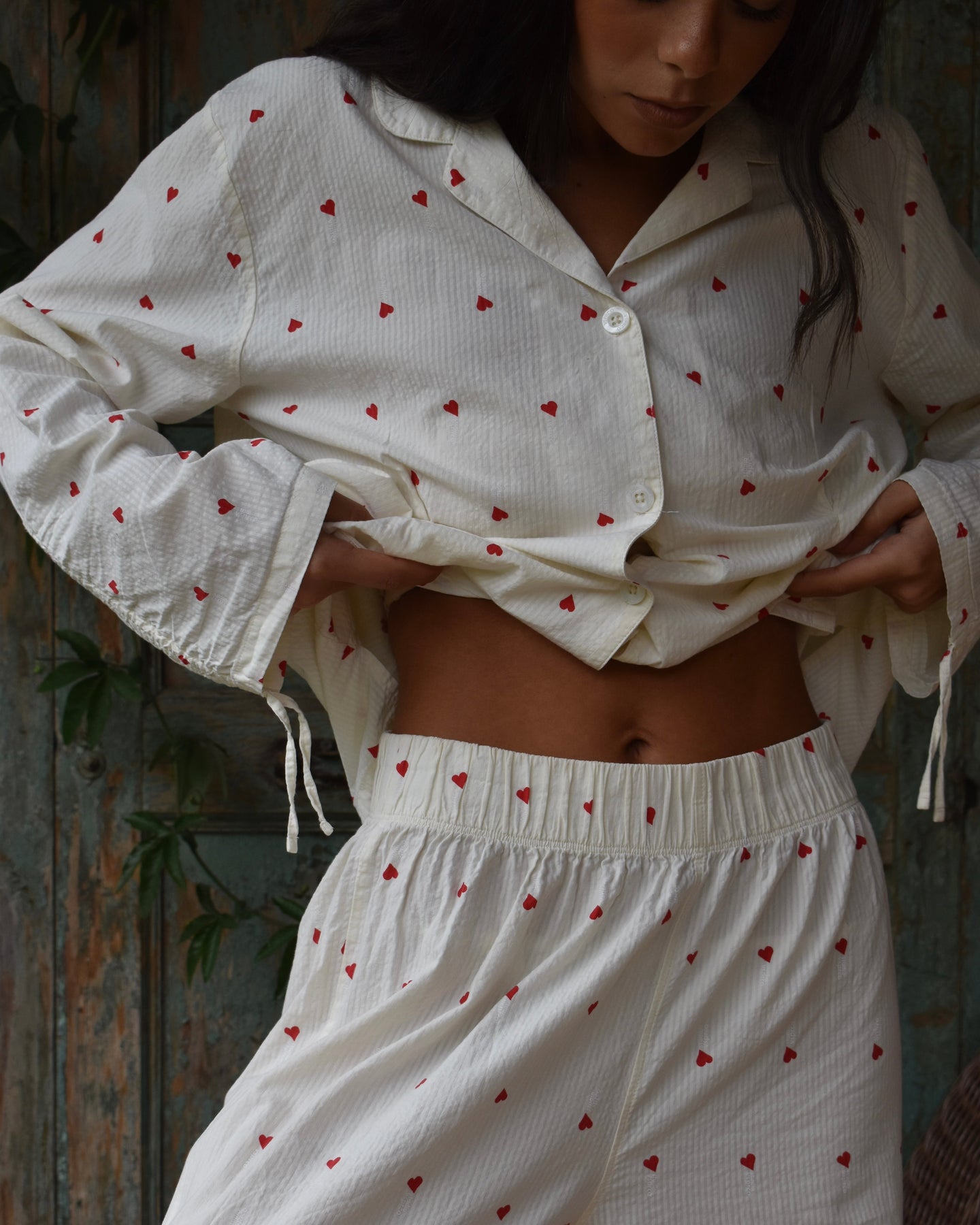 Vi introduserer vårt koselige og stilige Vinterhjerte-sett, perfekt for late søndager og alle netter imellom. Laget av delikat 100 % bomullsseersucker-stoff, er disse pysjamasene både myke og pustende, slik at du kan sove godt og holde deg komfortabel hele natten.